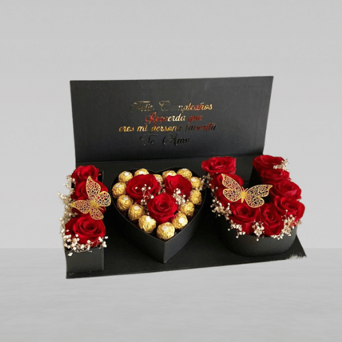 Box de letras I ❤️ U con una hermosa combinación de 16 rosas naturales, adornadas con delicadas ramas de gypso. Incluye 14 bombones Ferrero, mariposas decorativas y cubierta personalizada con frase.