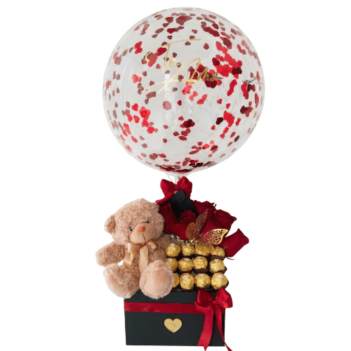 Linda caja con peluche (modelo segun disponibilidad), 7 rosas naturales, 12 bombones ferrero rocher y globo burbuja personalizado con frase.